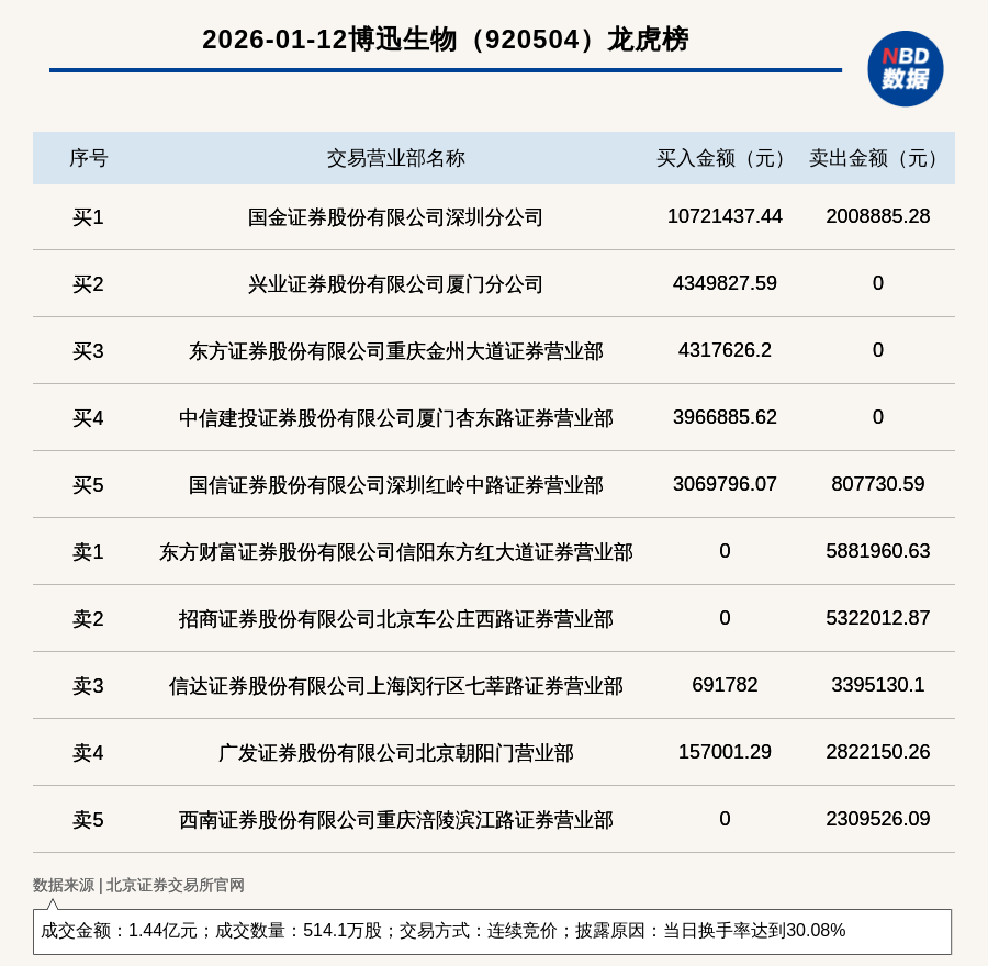 每經(jīng)訊,2026年1月12日,北交所上市公司博迅生物(920504,收盤價(jià):28.38元)登上龍虎榜,交易方式是連續(xù)競(jìng)價(jià),披露原因是當(dāng)日換手率達(dá)到30.08%,成交數(shù)量514.1萬(wàn)股,成交金額1.44億元。買一席位為國(guó)金證券股份有限公司深圳分公司,買入1072.14萬(wàn)元;賣一席位為東方財(cái)富證券股份有限公司信陽(yáng)東方紅大道證券營(yíng)業(yè)部,賣出588.2萬(wàn)元。