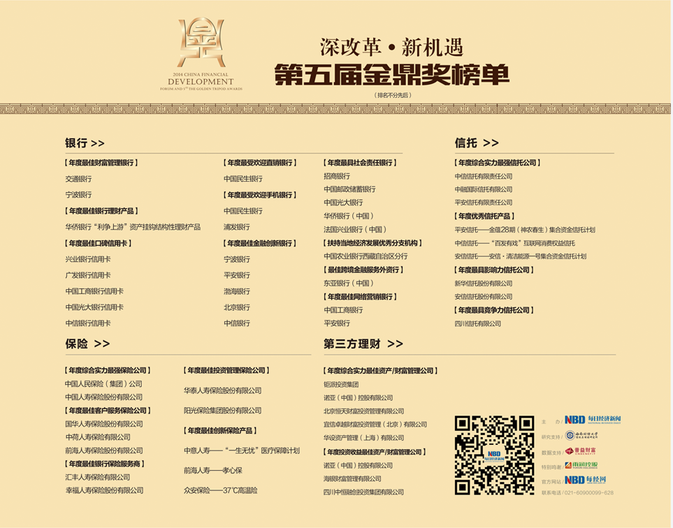 “金鼎獎(jiǎng)” 作為《每日經(jīng)濟(jì)新聞》全力打造的核心品牌活動(dòng)之一,已經(jīng)成功舉辦四屆,其憑借專業(yè)、權(quán)威的評(píng)選標(biāo)準(zhǔn)得到了社會(huì)各界的廣泛 關(guān)注與認(rèn)可,成為冬季中國金融行業(yè)最受矚目的大事記。今年,《每日經(jīng)濟(jì)新聞》繼續(xù)聯(lián)合權(quán)威學(xué)術(shù)單位,運(yùn)用科學(xué)的模型和研究方法,為 中國高端投資者提供一份公正、權(quán)威的金融產(chǎn)品、品牌和團(tuán)隊(duì)機(jī)構(gòu)的榜單。